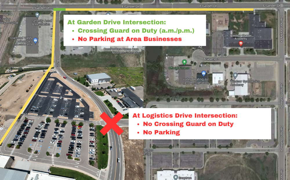 Diamond Valley is a drop-off zone only; parking on Diamond Valley, including Garden Drive north of Future Legends, is no longer permitted.