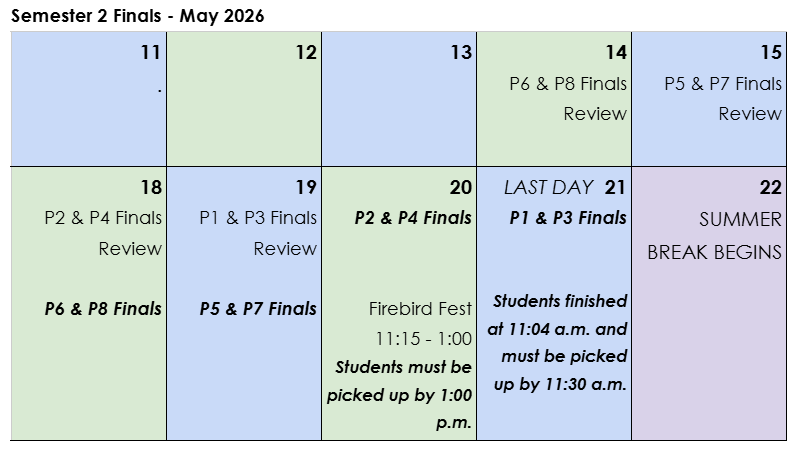 High school students will have review sessions for final exams beginning May 14th. Students will need to be picked up on May 20th by 1:00 p.m. after Firebird Fest. On May 21st, the last day of school, students will be released early at 11:30 a.m. The final exam schedule is as follows: