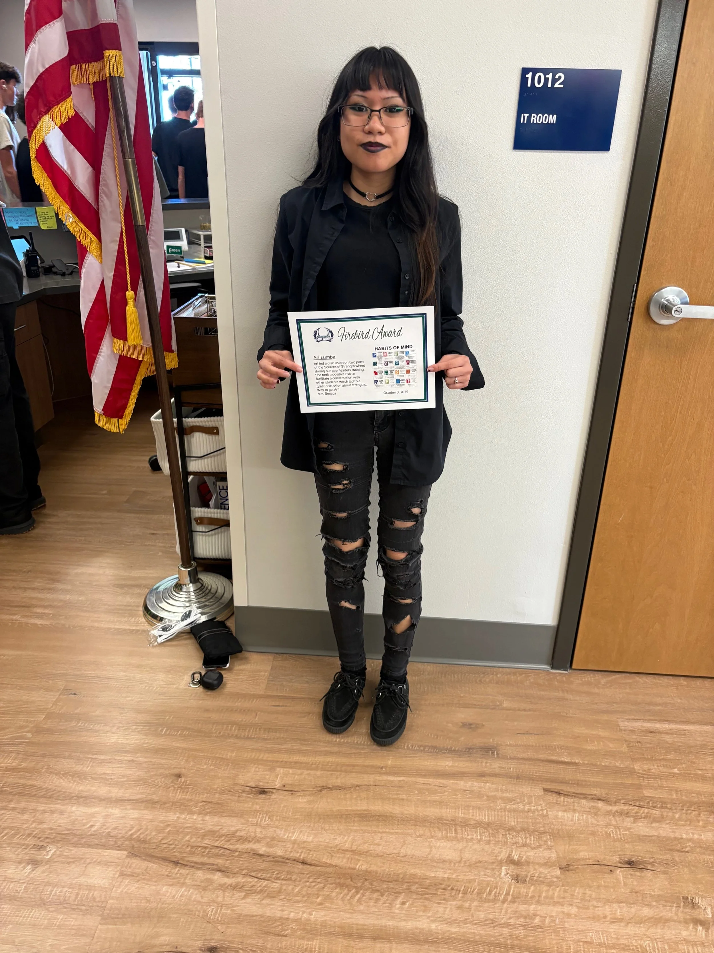 Ari L. was recognized as a Firebird Award winner! Ms. Seneca shared, "Ari led a discussion on two parts of the Sources of Strength wheel during our peer leader training. She took a positive approach to facilitate a conversation with other students, which led to a great discussion about strengths. Way to go, Ari!”