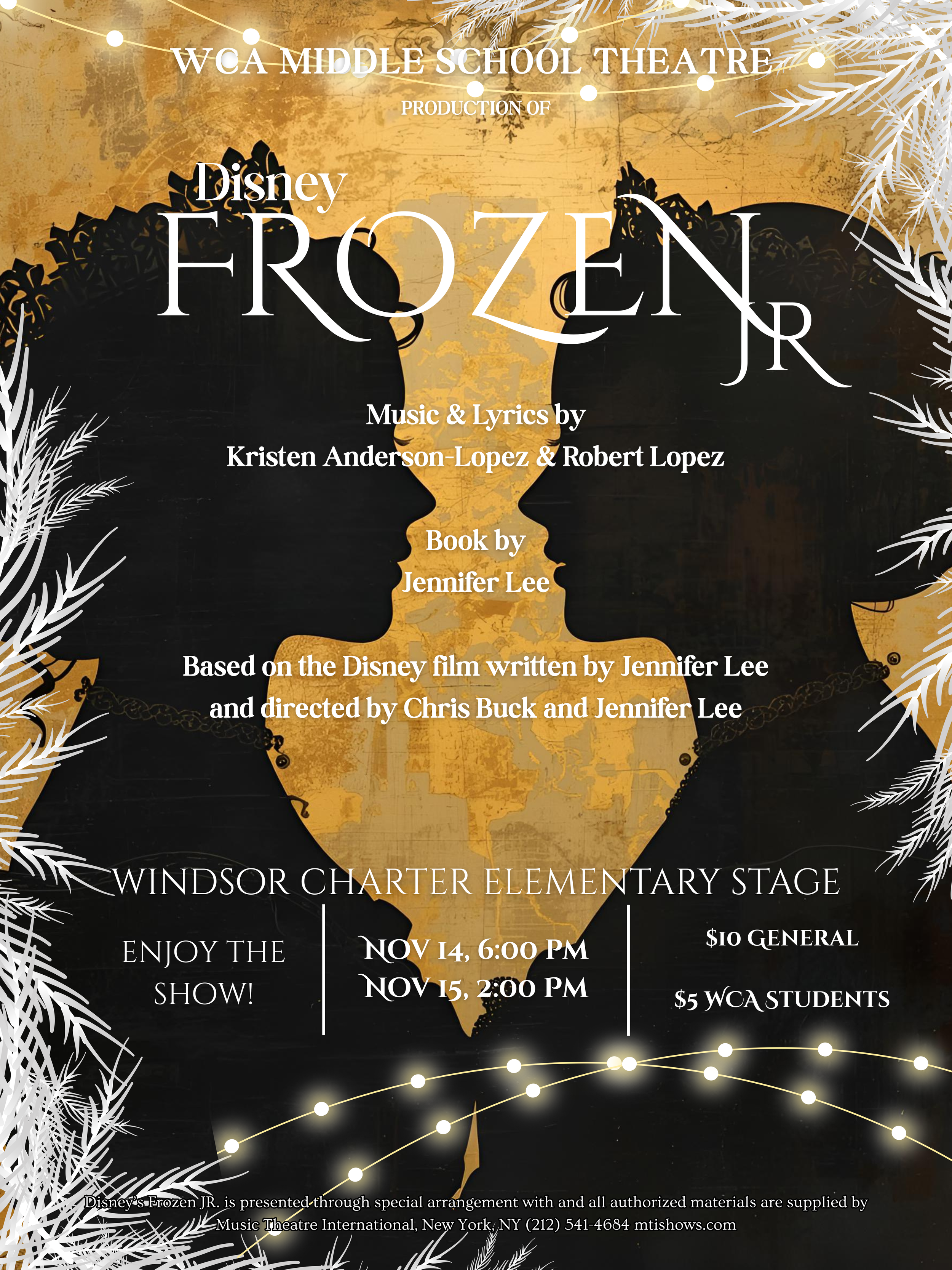 Windsor Charter Academy Middle School Theatre is proud to present its production of Frozen, Junior—a story of two royal sisters, whose close bond is tested when Elsa’s powerful magic is revealed. Join us on the journey with Kristoff, his loyal reindeer Sven, and the ever-optimistic snowman, Olaf!